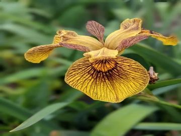 Striking hybrid with yellow flowers and heavy brown or maroon veining.